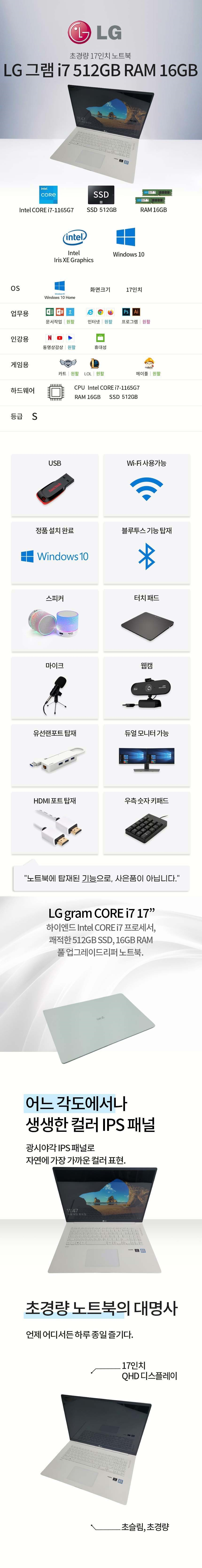 이미지 확대보기LG 17인치 대화면 그램 i7 11TH RAM 16GB SSD 512GB 쿼드코어 고사양 가벼운
